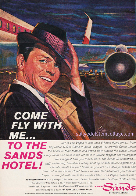 Frank Sinatra, tuo nilkkasukkatyttöjen ikuisten unelmien kohde, näyttelijä, laulaja, epäilty mafioso ja kerrassaan charmantti mies. Aivan kuten tänäkin päivänä, myös 1960-luvulla nimekkäitä tähtiä käytettiin mainoskampanjoissa tuomaan brändille lisää nostetta. Ja täytynee vielä todeta, ettei nimi miestä pahenna. Yllä olevassa kuvassa Frank Sinatra on ikuistettu The Sands -hotellin mainoskasvoksi. Vuonna 1961 ilmestynyt mainos on kaiken lisäksi hauska interteksti, sillä Sinatran albumi Come Fly with Me julkaistiin kolme vuotta aikaisemmin vuonna 1958. Frank toivottaa loistavaa viikonloppua, Come Fly with Us! Sarjassa esitellään tunnettuja Frankeja ja heidän erinäisiä kytköksiään mainonnan maailmaan. Me palaamme aiheeseen jälleen ensi perjantaina.